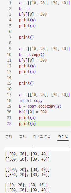 2차원 리스트의 할당과 복사 2차원 이상의 다차원 리스트는 리스트를 완전히 복사하려면 copy 메서드 대신 copy 모듈의 deepcopy 함수를 사용