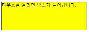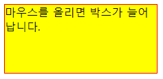 <head> <title>Document</title> <style> div { width: 100px; height: 100px; background: yellow; border: 1px solid red; transition: width 2s; } div:hover { width: 300px; } </style> </head> <body> <div>마우스를 올리면 박스가 늘어납니다.</div> </body>