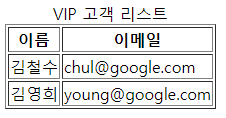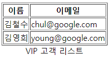 <!DOCTYPE html> <html> <head> <title>Document</title> <style> caption {caption-side: bottom;} </style> </head> <body> <table border="1"> <caption>VIP 고객 리스트</caption> <tr> <th>이름</th> <th>이메일</th> </tr> <tr> <td>김철수</td> <td>chul@google.com</td> </tr> <tr> <td>김영희</td> <td>young@google.com</td> </tr> </table> </body> </html>