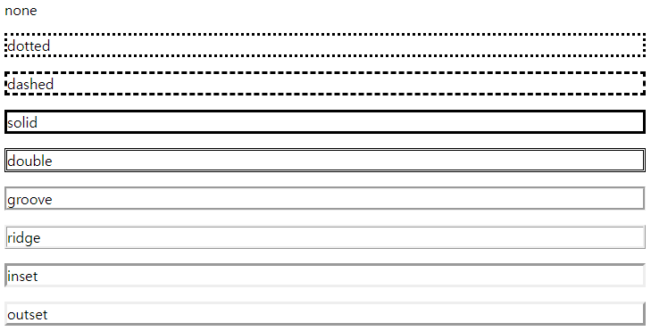 <body> <p style="border-style: none">none</p> <p style="border-style: dotted">dotted</p> <p style="border-style: dashed">dashed</p> <p style="border-style: solid">solid</p> <p style="border-style: double">double</p> <p style="border-style: groove">groove</p> <p style="border-style: ridge">ridge</p> <p style="border-style: inset">inset</p> <p style="border-style: outset">outset</p> </body>