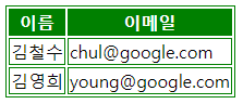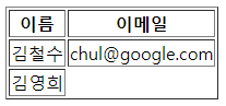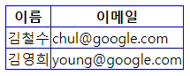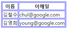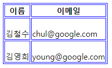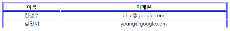 <!DOCTYPE html> <html> <head> <title>Document</title> <style> table, td, th { border: 1px solid blue; } table { width: 100%; } td { text-align: center; } </style> </head> <body> <table> <tr> <th>이름</th> <th>이메일</th> </tr> <tr> <td>김철수</td> <td>chul@google.com</td> </tr> <tr> <td>김영희</td> <td>young@google.com</td> </tr> </table> </body> </html>