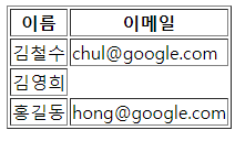 <head> <title>Document</title> <style> table { border-collapse: separate; empty-cells: hide; } </style> </head> <body> <table border="1"> <tr> <th>이름</th> <th>이메일</th> </tr> <tr> <td>김철수</td> <td>chul@google.com</td> </tr> <tr> <td>김영희</td> </tr> </table> </body>