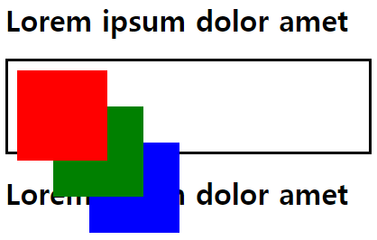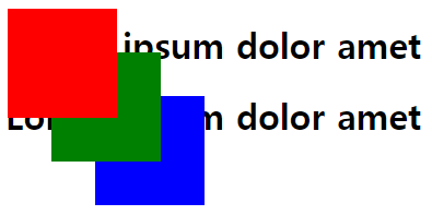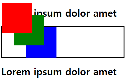 <!DOCTYPE html> <html> <head> <title>CSS Position Property</title> <style> .box { width: 100px; height: 100px; position: absolute; } .box:nth-child(1) { background-color: red; left: 10px; top: 10px; z-index: 100; } .box:nth-child(2) { background-color: green; left: 50px; top: 50px; z-index: 10; } .box:nth-child(3) { background-color: blue; left: 90px; top: 90px; z-index: 1; } </style> </head> <body> <h1>Lorem ipsum dolor amet</h1> <div> <div class="box"></div> <div class="box"></div> <div class="box"></div> </div> <h1>Lorem ipsum dolor amet</h1> </body> </html>