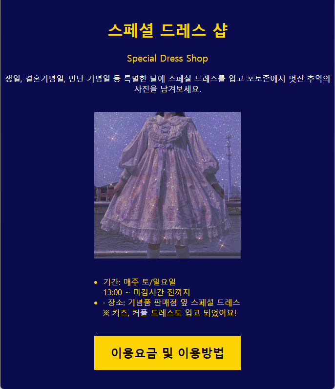 <!DOCTYPE html> <html> <head> <title>스페셜 드레스 샵</title> <style> body { color: #fcd303; background-color: #0a0c4d; width: 600px; display: inline; } img { margin-left: auto; margin-right: auto; display: block; float: inline-end; } .li {text-align: left; margin-left: 170px;} .font_big {font-size: 1.5em;} .font_bold {font-weight: bold;} .font_center {text-align: center;} .font_sizeup {font-size: 120%;} .button { width: 300px; line-height: 70px; background-color: #fcd303; margin-right: auto; margin-left: auto; } .button > a { display: block; text-decoration: none; color: black; } #explain { color: whitesmoke; } </style> </head> <body> <h1 class="font_center">스페셜 드레스 샵</h1> <p class="font_sizeup font_center">Special Dress Shop</p> <p id="explain" class="font_center">생일, 결혼기념일, 만난 기념일 등 특별한 날에 스페셜 드레스를 입고 포토존에서 멋진 추억의 사진을 남겨보세요.</p><br> <img src="C:\Users\mit012\Desktop\HTML STUDY\Dress.jpg" width="300"><br> <ul> <li class="li"> 기간: 매주 토/일요일 <div>13:00 ~ 마감시간 전까지</div></li> <li class="li">· 장소: 기념품 판매점 옆 스페셜 드레스 <div>※ 키즈, 커플 드레스도 입고 되었어요!</div></li><br> </ul> <div class="button"> <a href="#" class="font_big font_bold font_center">이용요금 및 이용방법</a> </div> </body> </html>