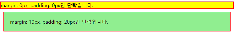 <head> <title>Document</title> <style> body { margin: 0px; padding: 0px; } p { margin: 0px; padding: 0px; background-color: yellow; border: 1px solid red; } #target { margin: 10px; padding: 20px; background-color: lightgreen; border: 1px solid red; } </style> </head> <body> <p>margin: 0px, padding: 0px인 단락입니다.</p> <P id="target">margin: 10px, padding: 20px인 단락입니다.</P> </body>