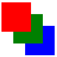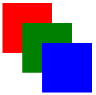 <style> .box { width: 100px; height: 100px; position: absolute; } .box:nth-child(1) { background-color: red; left: 10px; top: 10px; } .box:nth-child(2) { background-color: green; left: 50px; top: 50px; } .box:nth-child(3) { background-color: blue; left: 90px; top: 90px; } </style>