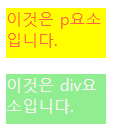 빈 셀 비워 두기 <head> <title>Document</title> <style> #target1 { width: 100px; height: 50px; background-color: yellow; color: tomato; } #target2 { width: 100px; height: 50px; background-color: lightgreen; color: whitesmoke; } </style> </head> <body> <p id="target1">이것은 p요소입니다.</p> <div id="target2">이것은 div요소입니다.</div> </body>