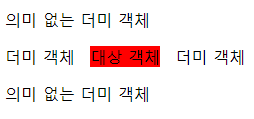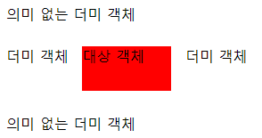<!DOCTYPE html> <html> <head> <title>CSS Display Property</title> <style> #box { display: inline; background-color: red; width: 100px; height: 50px; margin: 10px; } </style> </head> <body> <p>의미 없는 더미 객체</p> <span>더미 객체</span> <div id="box">대상 객체</div> <span>더미 객체</span> <p>의미 없는 더미 객체</p> </body> </html>