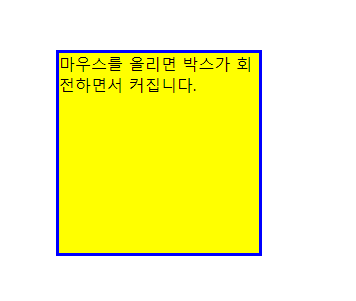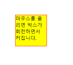 <head> <title>Document</title> <style> div { margin:50px; width: 100px; height: 100px; background: yellow; border: 1px solid red; transition: width 3s, height 3s, border 3s, transform 3s; } div:hover { width: 200px; height: 200px; border: 3px solid blue; transform: rotate(360deg); } </style> </head> <body> <div>마우스를 올리면 박스가 회전하면서 커집니다. </div> </body>