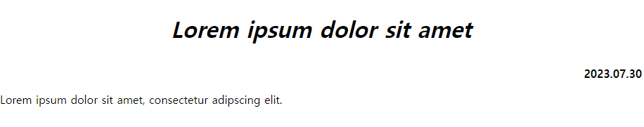 font-style 속성 글자 스타일 > italic(기울임) 같은 것들 font-weight 속성 글자 굵기 text-align 속성 글자 정렬 <!DOCTYPE html> <html> <head> <title>CSS Background Property</title> <style> .font_big {font-size: 2em;} .font_italic {font-style: italic;} .font_bold {font-weight: bold;} .font_center {text-align: center;} .font_right {text-align: right;} </style> </head> <body> <p class="font_big font_italic font_bold font_center">Lorem ipsum dolor sit amet</p> <p class="font_bold font_right">2023.07.30</p> <p>Lorem ipsum dolor sit amet, consectetur adipscing elit.</p> </body> </html>