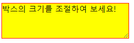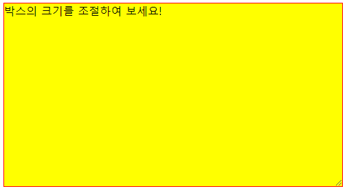 <!DOCTYPE html> <html> <head> <title>CSS-resize</title> <style> div { border: 1px solid red; background-color: yellow; width: 100px; height: auto; resize: both; overflow: auto; } </style> </head> <body> <div>박스의 크기를 조절하여 보세요!</div> </body> </html>