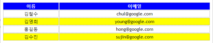 <head> <title>Document</title> <style> #list { font-family: 'Trebuchet MS', sans-serif; width: 100%; } #list td, #list th { border: 1px dotted gray; text-align: center; } #list th { color: white; background-color: blue; } #list tr.alt td { background-color: yellow; } </style> </head> <body> <table id="list"> <tr> <th>이름</th> <th>이메일</th> </tr> <tr> <td>김철수</td> <td>chul@google.com</td> </tr> <tr class="alt"> <td>김영희</td> <td>young@google.com</td> </tr> <tr> <td>홍길동</td> <td>hong@google.com</td> </tr> <tr class="alt"> <td>김수진</td> <td>sujin@google.com</td> </tr> </table> </body>
