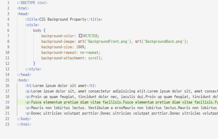 속성 설명 background-image 배경 이미지 삽입 background-size 배경 이미지의 크기 지정 background-repeat 배경 이미지의 반복 형태 지정 background-attachment 배경 이미지의 부착 형태 지정 background-position 배경 이미지의 위치 지정 background 한 번에 모든 배경 속성 입력 <!DOCTYPE html> <html> <head> <title>CSS Background Property</title> <style> body { background-image: url('BackgroundFront.png'), url('BackgroundBack.png'); background-size: 100%; } </style> </head> <body> </body> </html>