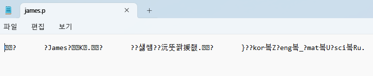 # 객체 읽기 with open('james.p', 'rb') as f: name = pickle.load(f) age = pickle.load(f) address = pickle.load(f) scores = pickle.load(f) print(name) print(age) print(address) print(scores) James # 실행 결과 17 서울시 서초구 {'kor': 90, 'eng': 95, 'mat': 85, 'sci': 82}