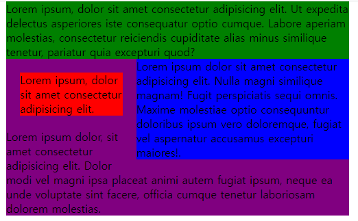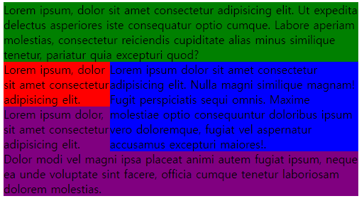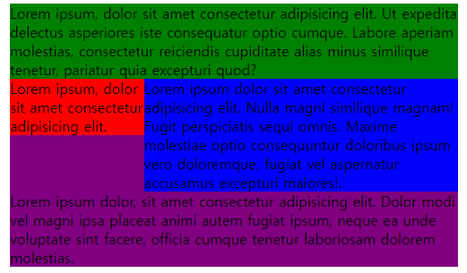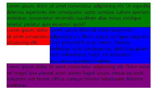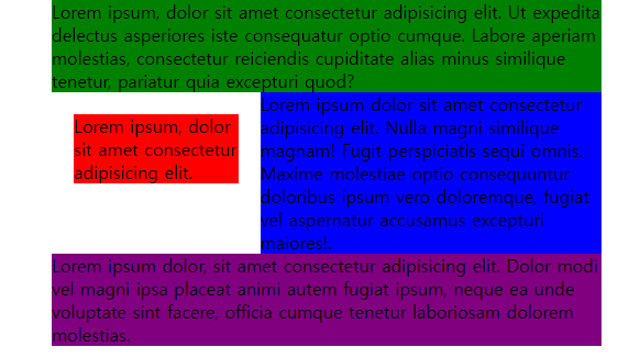 <style> body { width: 500px; margin: 10px auto; } /* #middle {overflow: hidden;} */ #left {float: left; width: 150px; background: red;} #right {float: right; width: 350px; background: blue;} #top {background: green;} #bottom {background: purple;} </style>위처럼 overflow 속성을 지정하지 않으면 float 속성을 적용한 자손이 있는 행을 다른 행이 침범