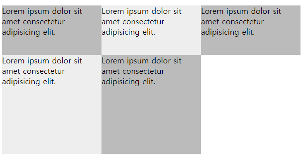 <!DOCTYPE html> <html> <head> <title>Float with Overflow</title> <style> #wrapper { display: grid; grid-template-columns: 200px 200px 200px; grid-template-rows: 100px 200px; margin: 30px; } .items:nth-child(2n+1) { background-color: #bbb; } .items:nth-child(2n) { background-color: #eee; } </style> </head> <body> <div id="wrapper"> <div class="items">Lorem ipsum dolor sit amet consectetur adipisicing elit.</div> <div class="items">Lorem ipsum dolor sit amet consectetur adipisicing elit.</div> <div class="items">Lorem ipsum dolor sit amet consectetur adipisicing elit.</div> <div class="items">Lorem ipsum dolor sit amet consectetur adipisicing elit.</div> <div class="items">Lorem ipsum dolor sit amet consectetur adipisicing elit.</div> </div> </body> </html>
