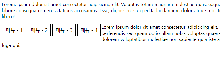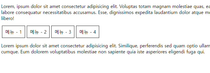<body> <p>Lorem, ipsum dolor sit amet consectetur adipisicing elit. Voluptas totam magnam molestiae quas, eaque in voluptatum labore consequatur necessitatibus accusamus. Esse, dignissimos expedita laudantium dolor atque mollitia eos consequatur libero!</p> <div class="clear"></div> <div> <div class="item">메뉴 - 1</div> <div class="item">메뉴 - 2</div> <div class="item">메뉴 - 3</div> <div class="item">메뉴 - 4</div> </div> <div class="clear"></div> <p>Lorem ipsum dolor sit amet consectetur adipisicing elit. Similique, perferendis sed quam optio ullam nobis voluptas quaerat cumque. Eum dolorem voluptatibus molestiae non sapiente quia iste asperiores eligendi fuga qui.</p> </body>CSS에서 적용