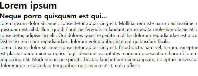<!DOCTYPE html> <html> <head> <title>Float with Overflow</title> <style> /* 초기화 */ * {margin: 0; padding: 0;} /* 주제 */ body { margin: 0 auto; width: 960px; } </style> </head> <body> <h1>Lorem ipsum</h1> <h2>Neque porro quisquam est qui...</h2> <p>Lorem ipsum dolor sit amet, consectetur adipisicing elit.</p> <p>Ex ad dicta, nam vel, harum, excepturi a adipisci explicabo reprehenderit est placeat unde minima optio.</p> </body> </html>