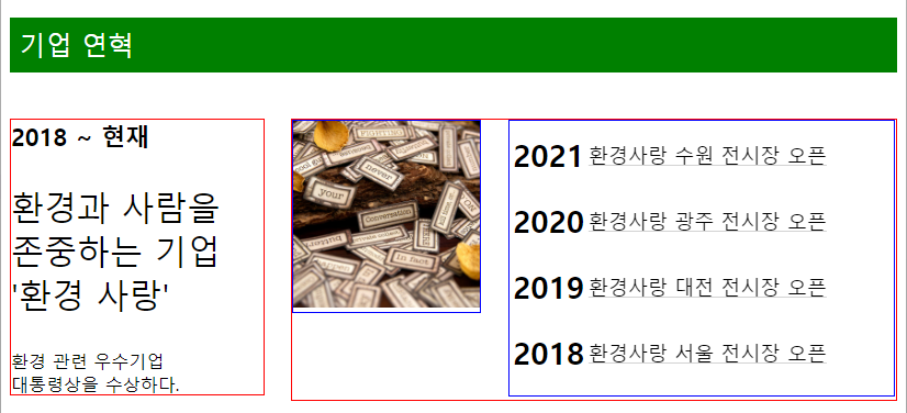 <!DOCTYPE html> <html> <head> <title>연습 1</title> <style> #top { background: green; margin: 0 auto; height: 50px; color: white; font-size: 24px; line-height: 50px; position: relative; } #middle { overflow: hidden; } #left { width: 230px; height: 250px; border: 1px solid red; float: left; } .lside_1 { font-size: 22px; font-weight: bold; margin: 0%; } .lside_2 { font-size: 30px; } .lside_3 { margin-top: 30px; } #right { width: 550px; height: 255px; border: 1px solid red; float: right; } .rbox1 { border: 1px solid blue; position: absolute; } .rbox2 { border: 1px solid blue; position: absolute; width: 350px ; height: 250px; right: 10px; } table { line-height: 3.5em; } th {font-size: 28px;} td { font-size: 18px; text-decoration: underline lightgray; position: fixed; } </style> </head> <body> <div id="top"> <p> 기업 연혁</p> </div> <br> <br> <div id="middle"> <div id="left"> <p class="lside_1">2018 ~ 현재 <p> <p class="lside_2">환경과 사람을<br>존중하는 기업<br>'환경 사랑'</p> <p class="lside_3">환경 관련 우수기업<br>대통령상을 수상하다.<p> </div> <div id="right"> <div class="rbox1"><img src="Chocolate.jpg" width="170"></div> <div class="rbox2"> <table> <tr> <th>2021</th> <td>환경사랑 수원 전시장 오픈</td> </tr> <tr> <th>2020</th> <td>환경사랑 광주 전시장 오픈</td> </tr> <tr> <th>2019</th> <td>환경사랑 대전 전시장 오픈</td> </tr> <tr> <th>2018</th> <td>환경사랑 서울 전시장 오픈</td> </tr> </table> </div> </div> </div> </body> </html>연습 문제 2