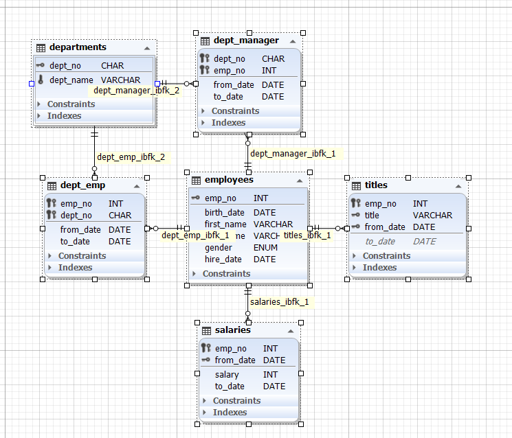employees 데이터베이스를 드래그해 빈 다이어그램에 가져오면 자동으로 다이어그램이 생성됨