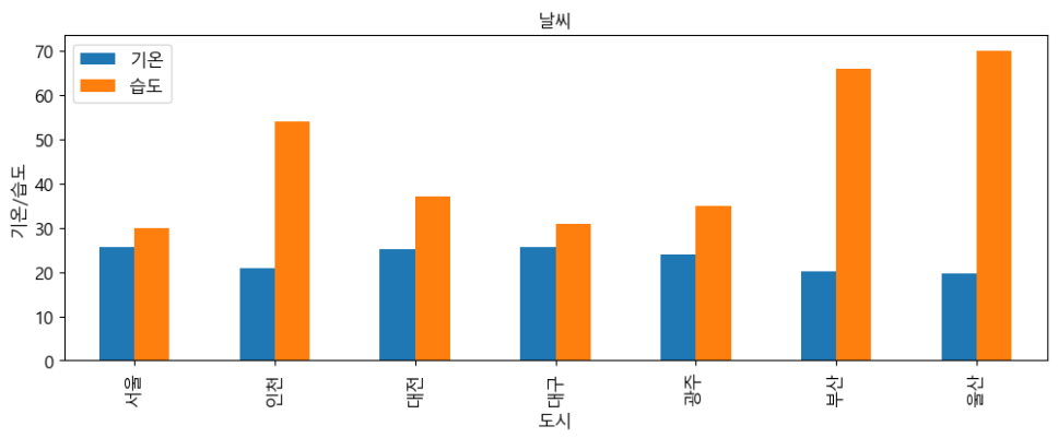 # Windows 한글 폰트 설정 font_name = mpl.font_manager.FontProperties(fname='C:/Windows/Fonts/malgun.ttf').get_name() mpl.rc('font', family=font_name) # 차트 종류, 제목, 차트 크기, 범례, 폰트 크기 설정 ax = city_df.plot(kind='bar', title='날씨', figsize=(12, 4), legend=True, fontsize=12) ax.set_xlabel('도시', fontsize=12) # x축 정보 표시 ax.set_ylabel('기온/습도', fontsize=12) # y축 정보 표시 ax.legend(['기온', '습도'], fontsize=12) # 범례 지정