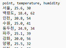 with open('weather.csv', 'w') as file: # weather.csv 파일을 쓰기 모드로 열기 file.write('point, temperature, humidity\n') # 컬럼 이름 추가 for i in data: # data를 반복하면서 file.write('{0}, {1}, {2}\n'.format(i[0], i[1], i[2])) # 지점, 온도, 습도를 줄 단위로 저장메모장이나 기타 텍스트 편집기로 열어 보면