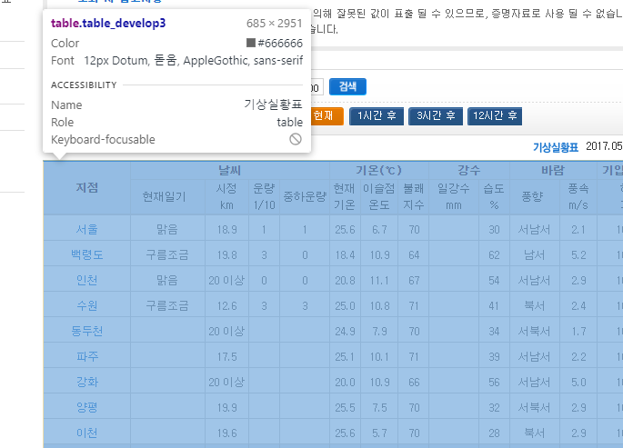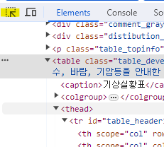 import requests # 웹 페이지의 HTML을 가져오는 모듈 from bs4 import BeautifulSoup # HTML을 파싱하는 모듈 # 웹 페이지를 가져온 뒤 BeautifulSoup 객체로 만듦 response = requests.get('https://pythondojang.bitbucket.io/weather/observation/currentweather.html') soup = BeautifulSoup(response.content, 'html.parser') # <table class="table_develop3">을 찾음 table = soup.find('table', { 'class': 'table_develop3' }) data = [] # 데이터 저장할 리스트 생성 for tr in table.find_all('tr'): # 모든 tr 태그 찾아 반복(각 지점 데이터 찾기) tds = list(tr.find_all('td')) # 모든 td 태그 찾아 리스트로 만듦(각 날씨 값을 리스트로) for td in tds: # td 태그 리스트 반복(날씨 값 가져옴) if td.find('a'): # 지점인지 확인 point = td.find('a').text temperature = tds[5].text # <td> 태그 리스트의 여섯 번째(인덱스5)에서 기온 가져옴 humidity = tds[9].text # <td> 태그 열 번째에서 습도를 가져옴 data.append([point, temperature, humidity]) # data 리스트에 지점, 기온, 습도 추가 data # 실행 결과 [['서울', '25.6', '30'], ['백령도', '18.4', '62'], ['인천', '20.8', '54'], ['수원', '25.0', '41'], ['동두천', '24.9', '34'], ['파주', '25.1', '39'], ['강화', '20.0', '56'], ['양평', '25.5', '32'], ['이천', '25.6', '28'], ['북춘천', '24.6', '36'], ['북강릉', '19.9', '56'], ['울릉도', '16.8', '77'], ['속초', '19.1', '75'], ['철원', '23.9', '37'], ['대관령', '17.9', '49'], ['춘천', '25.7', '39'], ['강릉', '22.7', '41'], ['동해', '19.5', '77'], ['원주', '23.4', '36'], ['영월', '24.2', '34'], ['인제', '24.3', '31'], ['홍천', '25.4', '25'], ['태백', '19.6', '43'], ['정선군', '23.0', '32'], ['서산', '23.6', '49'], ['청주', '24.3', '33'], ['대전', '25.1', '37'], ['충주', '24.4', '32'], ['추풍령', '23.0', '35'], ['홍성(예)', '24.3', '46'], ['제천', '24.2', '32'], ['보은', '23.7', '28'], ['천안', '23.5', '35'], ['보령', '21.4', '56'], ['부여', '23.9', '37'], ['금산', '23.7', '30'], ['전주', '24.9', '44'], ['광주', '24.0', '35'], ['목포', '22.8', '51'], ['여수', '22.8', '49'], ['흑산도', '19.2', '93'], ['군산', '21.8', '55'], ['완도', '23.2', '45'], ['고창', '22.7', '53'], ['순천', '22.5', '40'], ['진도(첨찰산)', '22.2', '48'], ['부안', '22.9', '44'], ['임실', '22.8', '40'], ['정읍', '23.8', '47'], ['남원', '23.8', '35'], ['장수', '22.0', '33'], ['고창군', '23.7', '48'], ['영광군', '22.4', '40'], ['순창군', '23.5', '38'], ['보성군', '23.7', '34'], ['강진군', '24.1', '33'], ['장흥', '25.5', '33'], ['해남', '24.6', '40'], ['고흥', '24.4', '34'], ['광양시', '24.6', '43'], ['진도군', '21.9', '58'], ['제주', '20.7', '60'], ['고산', '19.1', '74'], ['성산', '23.1', '33'], ['서귀포', '24.0', '43'], ['안동', '25.0', '32'], ['포항', '19.0', '83'], ['대구', '25.7', '31'], ['울산', '19.7', '70'], ['창원', '20.6', '63'], ['부산', '20.2', '66'], ['울진', '17.6', '84'], ['상주', '25.0', '32'], ['통영', '20.0', '71'], ['진주', '23.8', '30'], ['김해시', '21.9', '60'], ['북창원', '22.8', '50'], ['양산시', '21.4', '63'], ['의령군', '25.1', '40'], ['함양군', '23.3', '38'], ['봉화', '22.0', '38'], ['영주', '23.0', '36'], ['문경', '25.5', '26'], ['청송군', '17.9', '71'], ['영덕', '19.4', '57'], ['의성', '25.7', '25'], ['구미', '25.7', '32'], ['영천', '21.8', '47'], ['경주시', '23.8', '49'], ['거창', '22.7', '38'], ['합천', '25.1', '32'], ['밀양', '24.7', '34'], ['산청', '24.8', '41'], ['거제', '23.1', '57'], ['남해', '24.5', '40']]데이터를 csv 파일에 저장하기