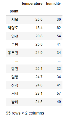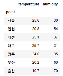 # %matplotlib inline을 설정하면 matplotlib.pyplot의 show 함수 호출 없이도 주피터 노트북 안에서 그래프가 표시됨 %matplotlib inline import pandas as pd # 데이터 저장, 처리하는 패키지 import matplotlib as mpl # 그래프 그리는 패키지 import matplotlib.pyplot as plt # 그래프 그리는 패키지 # csv 파일을 읽어 DataFrame 객체로 만듦, 인덱스 컬럼은 point로 설정, 인코딩은 euc-kr로 설정 df = pd.read_csv('weather.csv', index_col='point', encoding='euc-kr') df실행 결과
